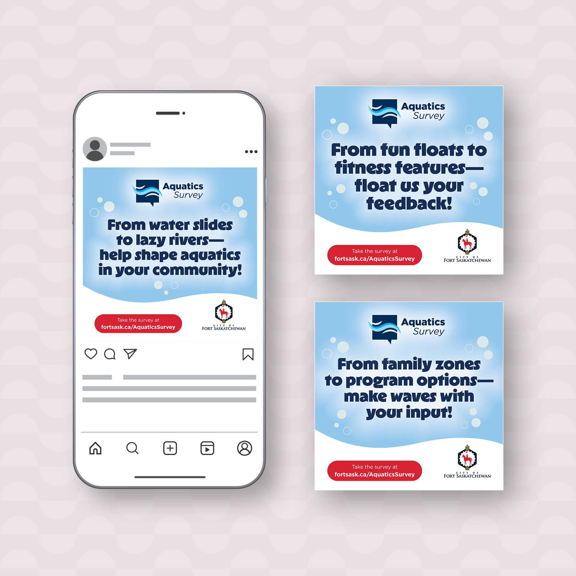 The Aquatics team was about to launch a community survey to gather resident feedback on amenities for the new pool. They came to design marketing materials to promote the survey, along with a few additional items like a Word document template for the report and some website images for the survey platform.Having been extremely please with the design we created for their 2024 Census campaign, they again wanted to use the “Aquatics Question” logo that we designed, and hoped for the creative to have the same feel as that campaign.