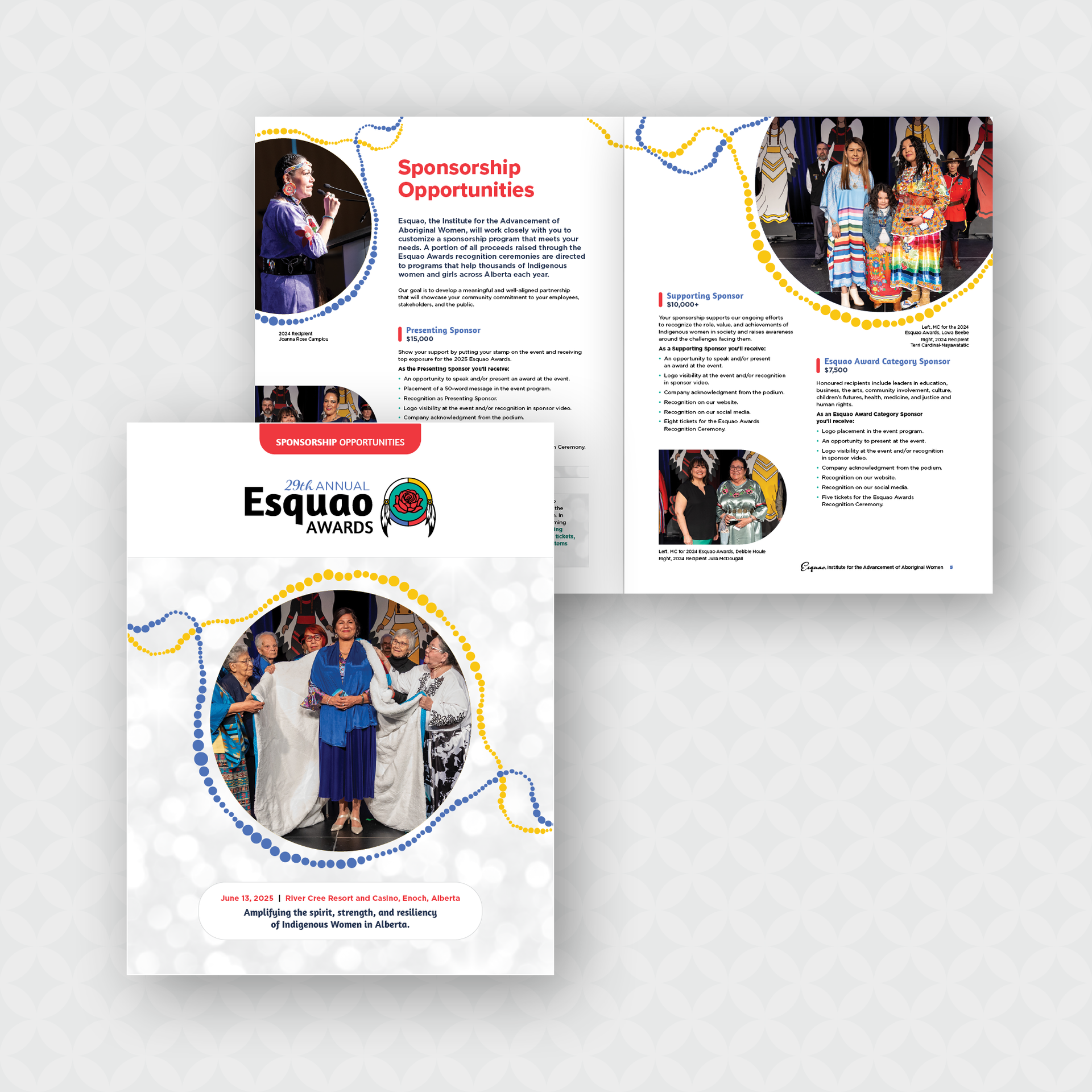 Each year, the Esquao Awards celebrate the strength, leadership, and achievements of First Nations, Métis and Inuit women from throughout Alberta. With the Gala being a prestegious event, metallic accents and background immagery are used to add elegance and prestige to the Esquao brand we previously established. The typography combines a strong, elegant script for headings, paired with a clean, legible sans-serif for body text to ensure accessibility. Photos from last year’s Gala are prominant throughout the pieces showcassing award recipients and highlighting the last year’s Circle of Honour Inductee as it is the high point of the Gala.Deliverables:
