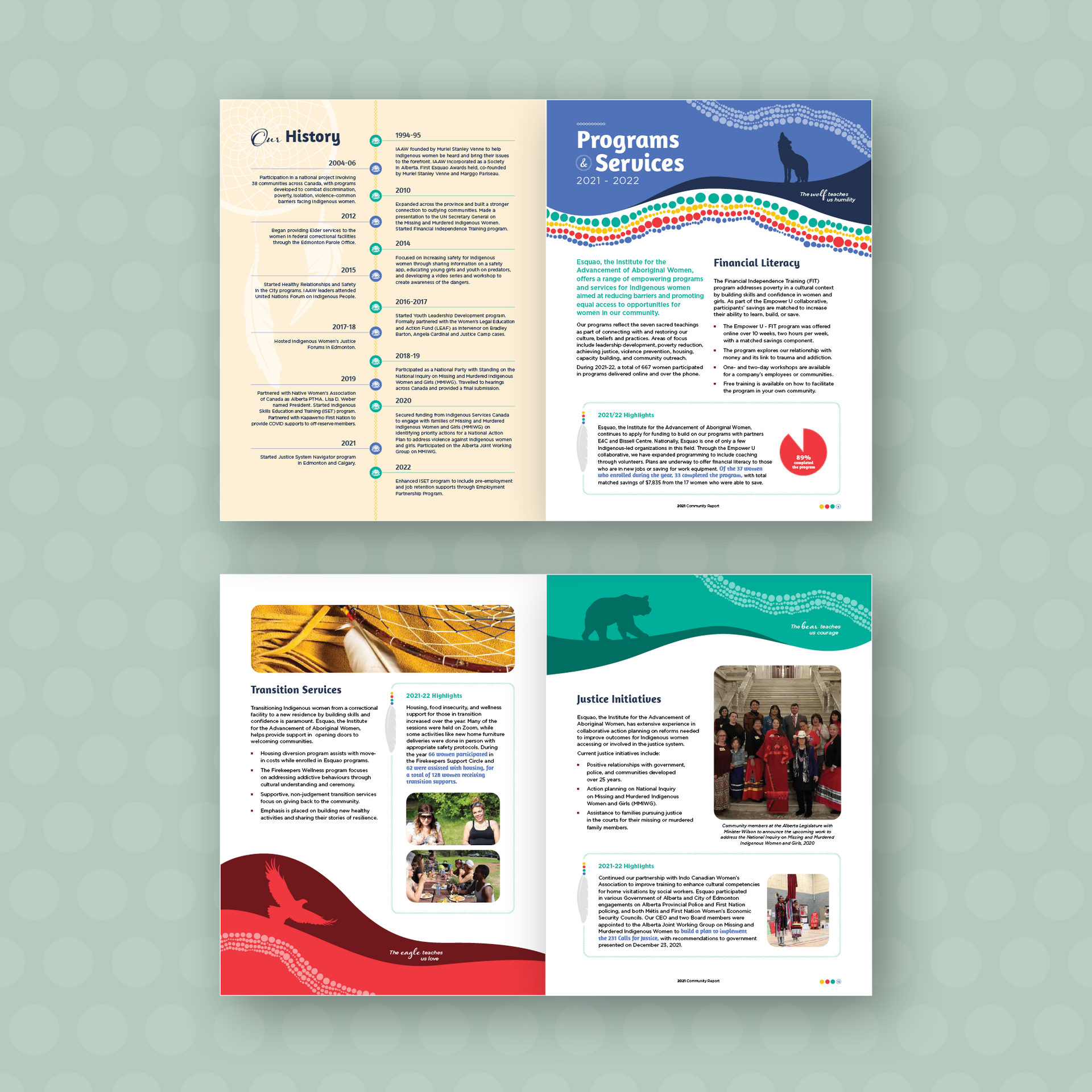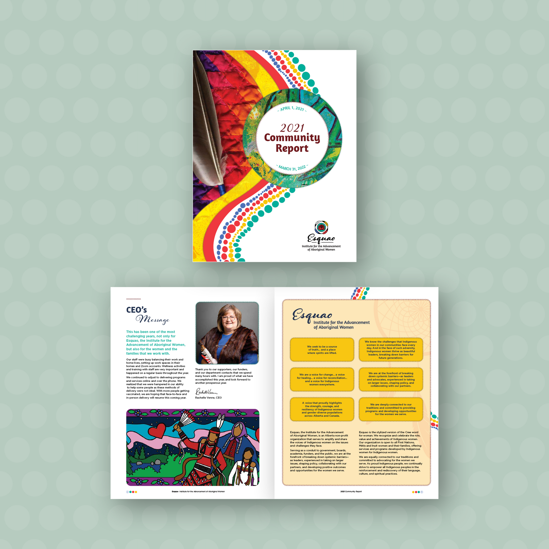 Through 313 surveys and four community gatherings over 10 months, the findings in this report are meant to contribute to transformational change through key issues affecting the needs of First Nation, Métis, Inuit, Indigenous women, and 2Spirit+ individuals (18+) and their families in both rural and urban communities across Alberta.The report design was based on the 2023 Community Report Diva previously designed, as it coincided with the growth and influence of Esquao over the past year. The main brand elements were applied which helped highlight the amazing work done by Esquao and showcased all the data, research, stories, and imagery gathered from various communities and their members through large imagery, bright and bold colours, and visual graphs and tables.