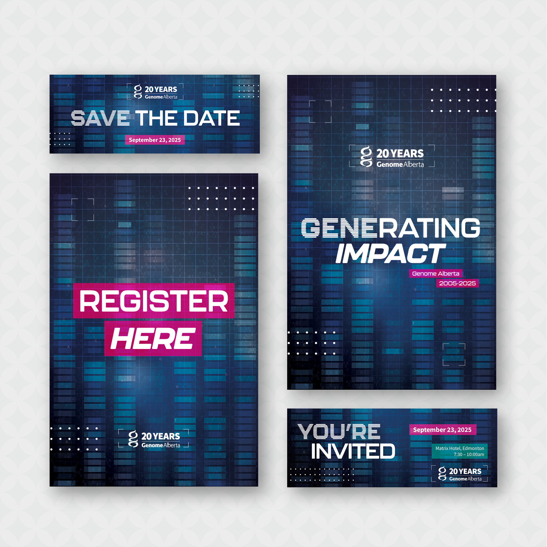 To celebrate their 20th Anniversary, Genome Alberta hosted a breakfast event for their stakeholders. The event creative follows the colour palette of the Genome Alberta brand with an added typeface for the title/headline treatment. Inspired by the futuristic look of an already-produced video for consistency at the events.