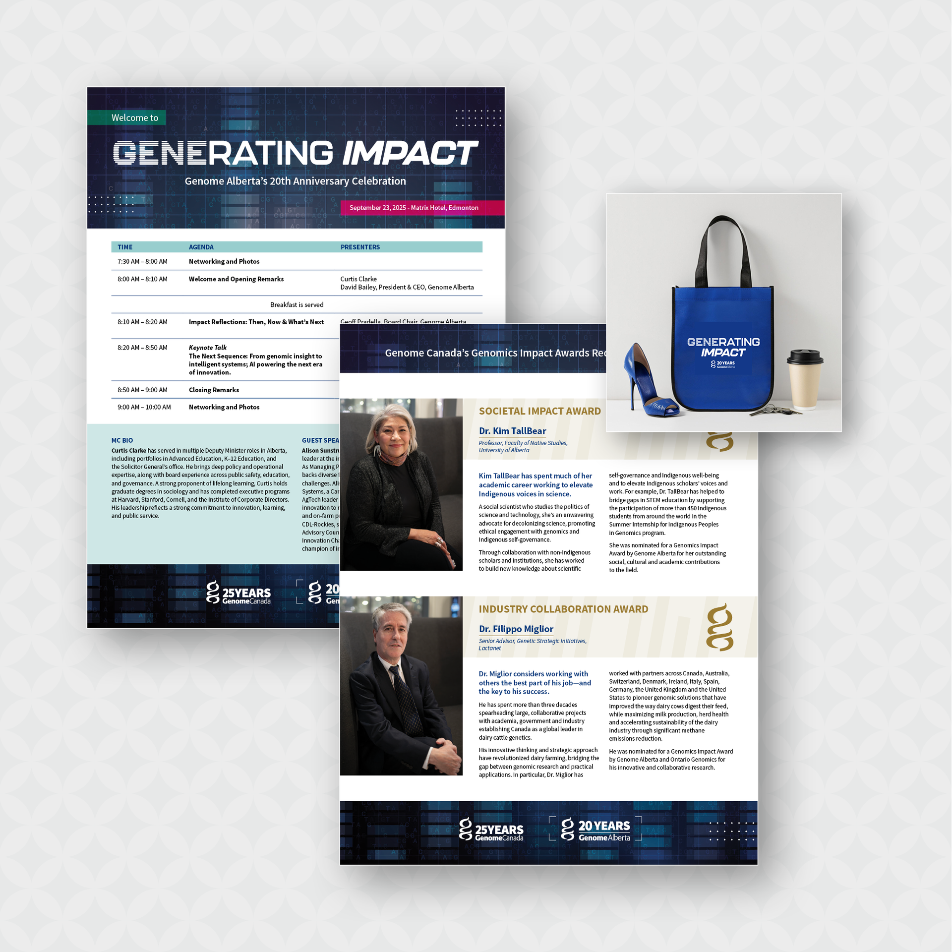 To celebrate their 20th Anniversary, Genome Alberta hosted a breakfast event for their stakeholders. The event creative follows the colour palette of the Genome Alberta brand with an added typeface for the title/headline treatment. Inspired by the futuristic look of an already-produced video for consistency at the events.The background is made up of multi-layered genomic graphics (sequencing bars and letters) in varying transparencies atop of a grid. We added 4-corner squares and 3-line dot patterns that are in the forefront. We used the Genome Alberta magenta as the predominant highlight colour, and their teal as the secondary colour. The typeface for the headline treatment is Kallisto - a modern tech style Adobe font - which is available in multiple different weights and styles. This helped with creating the headline “GENERATING IMPACT” to subtly highlight the word GENE with the horizontal bar style (which is also a nod to sequencing bars) without visually separating it from RATING and reading as two words.