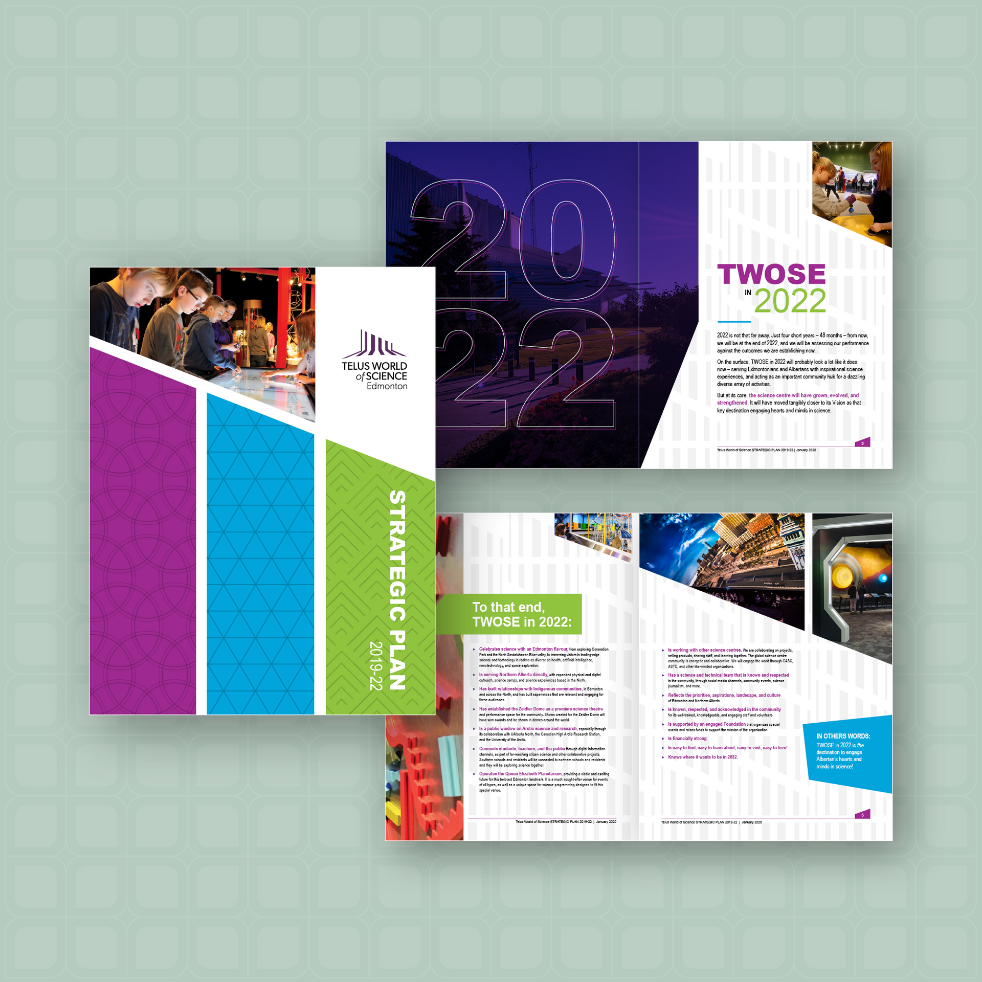 The logo we designed incorporates fireworks, a symbol of celebration and anniversaries, in the sky behind the building graphic in the original logo. The fireworks use the green and blue brand colours: green to contrast the purple of the original logo and blue to compliment it. It is a fun and playful approach that still keeps the primary Telus World of Science logo in the forefront.